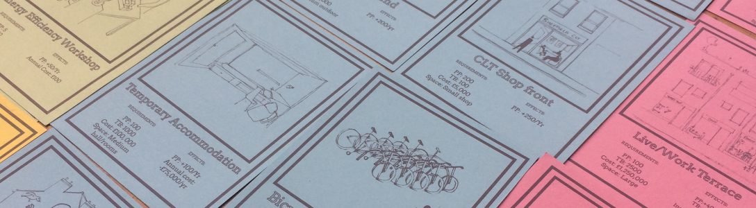City of Sharing version 0.5 introduced a full set of intervention and funding cards. A selection intervention cards from v0.5 colour coded to indicate the scale of the project.A selection of the v0.5 funding cards prior to cutting out. These are used by players to implement the interventions. The site map/game board was also populated… Continue reading Version 0.5 – Game mechanics test