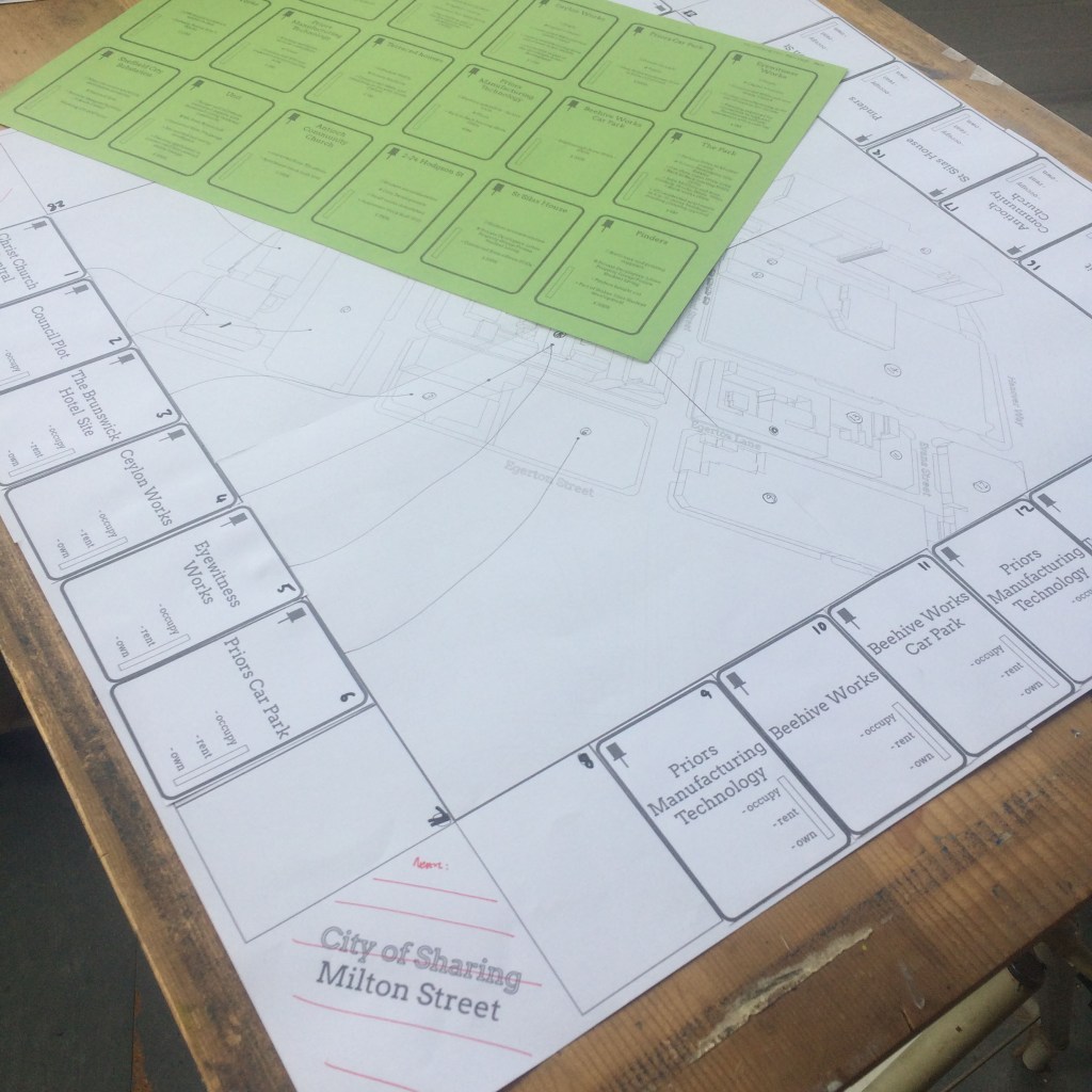 The design lent itself to a Monopoly style board. As the game’s purpose and game-play directly contradict Monopoly I think this is a useful juxtaposition.