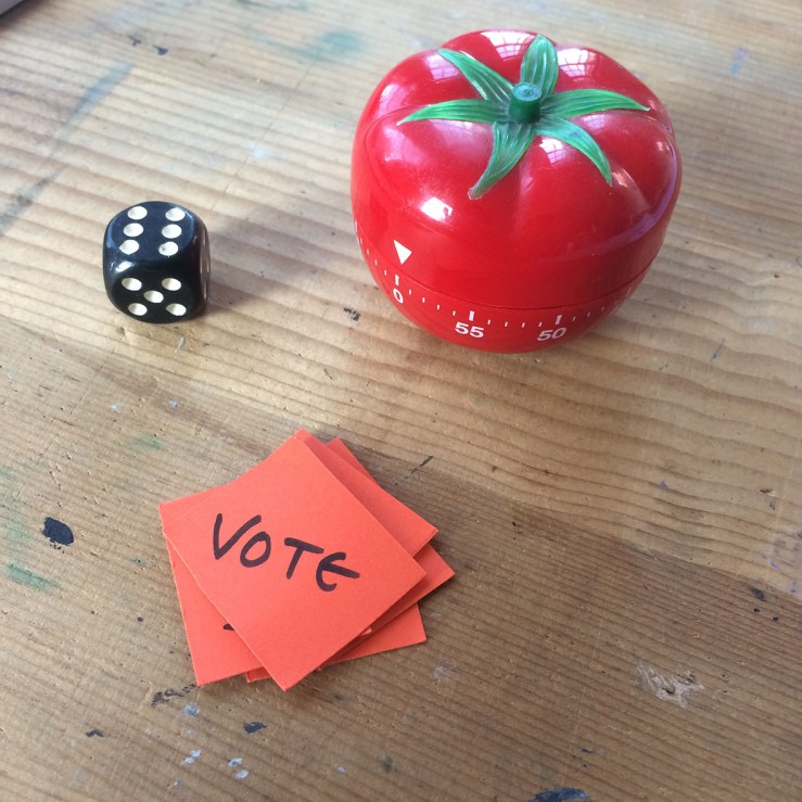 The game only requires a few pieces other than the cards; a single Die for chance rolls; a variable timer (I will try one that ticks and rings loudly so that players can keep track of it during noisy discussions); and a vote chip for each player.