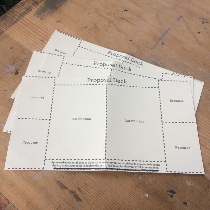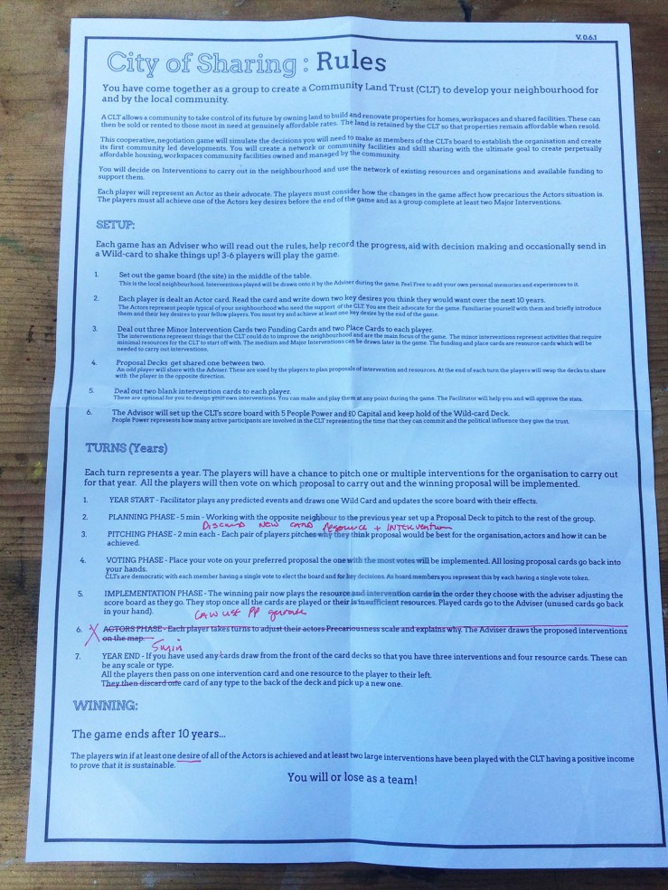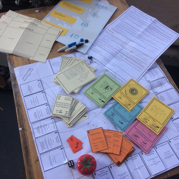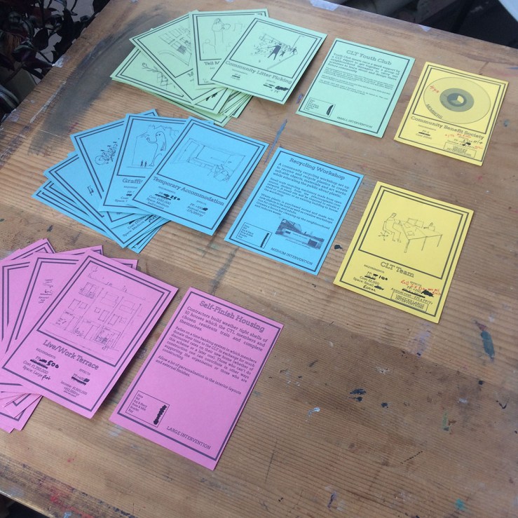 The Place Cards match the real world places shown on the Board. Most interventions will require a place to be situated in, so players will need to combine them together. The fronts of the cards show the requirements for using the place, while the backs provide further background information on each plot gathered from the site including ownership; current use; historical use; planned use etc. Players will be encouraged to add their own knowledge of the area onto the cards as they play.