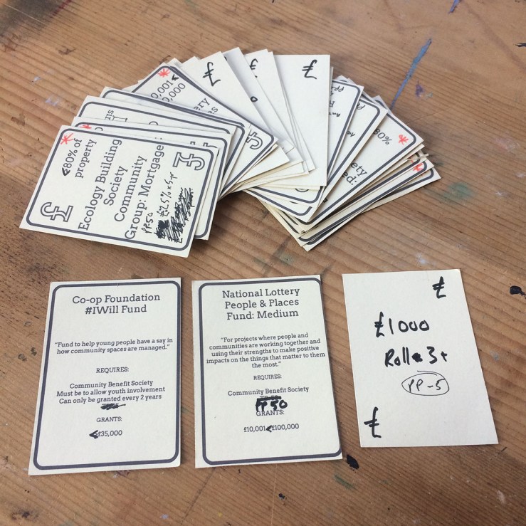 The Funding Cards are based on real world funding sources that could be used by a CLT. For this version a lot of the small cards are still in a draft format. The cards include the requirements needed for players to play them and background information on what they are.