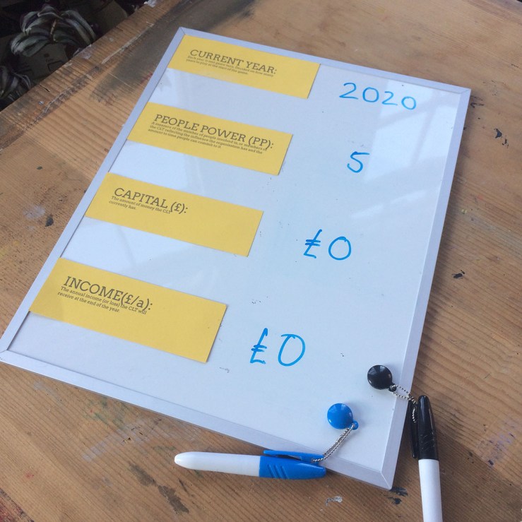 The Score Board has been simplified to a small white board which the Facilitator will keep up to date with the CLT’s current resources through the game.